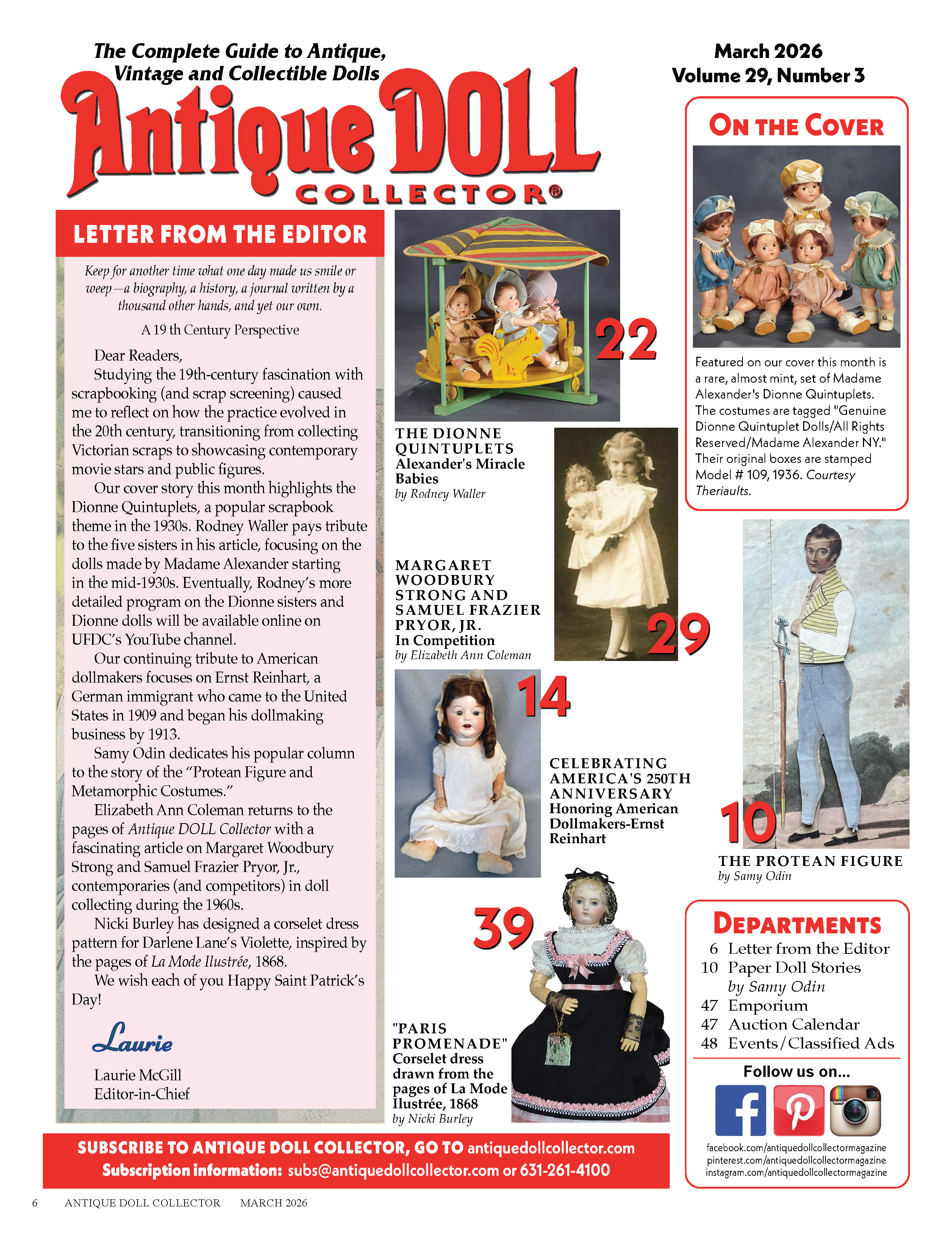 THE DIONNE QUINTUPLETS: Alexander's Miracle Babies by Rodney Waller PAPER DOLL STORIES: The Protean Figure by Samy Odin Margaret Woodbury Strong and Samuel Frazier Pryor, Jr. In Competition by Elizabeth Ann Coleman "PARIS PROMENADE" Corselet Dress Drawn From The Pages Of La Mode Ilustrée, 1868 by Nicki Burley CELEBRATING AMERICA'S 250TH ANNIVERSARY Honoring American Dollmakers-Ernst Reinhart Plus Auction Calendar…and more!