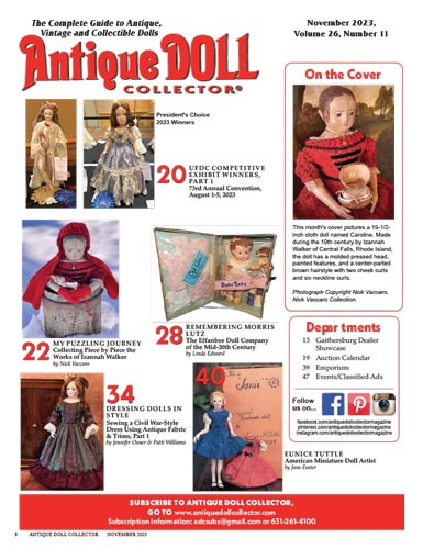 UFDC COMPETITIVE EXHIBIT WINNERS, PART 1 - 73rd Annual Convention, August 1-5, 2023 MY PUZZLING JOURNEY - Collecting Piece by Piece the Works of Izannah Walker by Nick Vaccaro REMEMBERING MORRIS LUTZ - The Effanbee Doll Company of the Mid-20th Century by Linda Edward DRESSING DOLLS IN STYLE - Sewing a Civil War-Style Dress Using Antique Fabric & Trims, Part 1 by Jennifer Osner & Patti Williams EUNICE TUTTLE - American Miniature Doll Artist by Jane Foster Auction Calendar…and more!