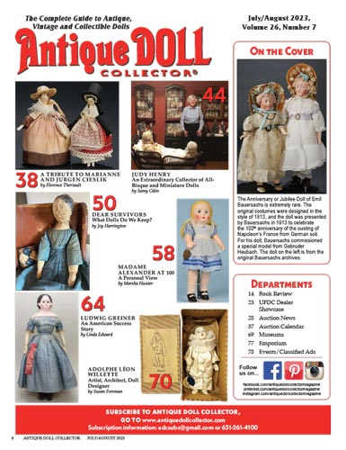 A Tribute to Marianne and Jurgen Cieslik by Florence Theriault Judy Henry: An Extraordinary Collector of All-Bisque and Miniature Dolls by Samy Odin Dear Survivors: What Dolls Do We Keep? by Joy Harrington Madame Alexander at 100: A Personal View by Marsha Hunter Ludwig Greiner: An American Success Story by Linda Edward Adolphe Leon Willette: Artist, Architect, Doll Designer by Susan Foreman Auction News and Calendar…and more!