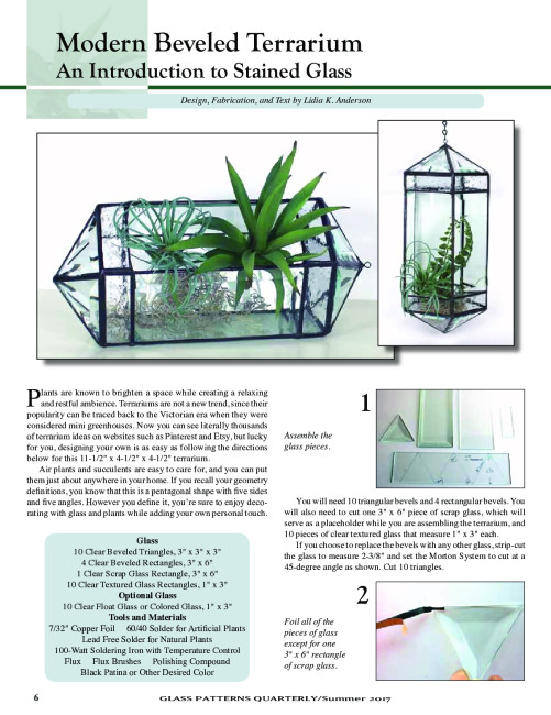 An 11 1/2" x 4 1/2" x 4 1/2" terrarium created with beveled clear glass rectangular and triangular shapes. The two end caps are each made with 5 beveled triangles, then joined to the ends of the rectangular shapes that form the pentagonal center section. This project was constructed using the copper foil technique. This article was originally published on page 6 in the Summer 2017 issue of Glass Patterns Quarterly. Design, Fabrication, and Text by Lidia K. Anderson