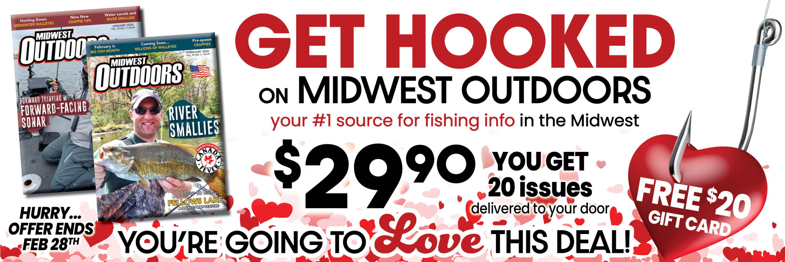 Two years of MidWest Outdoors' print and digital editions (20 issues) + a $20 TackleDirect.com eGift card (eGift card code with redemption instructions will be sent to recipient by email). $29.90 USD