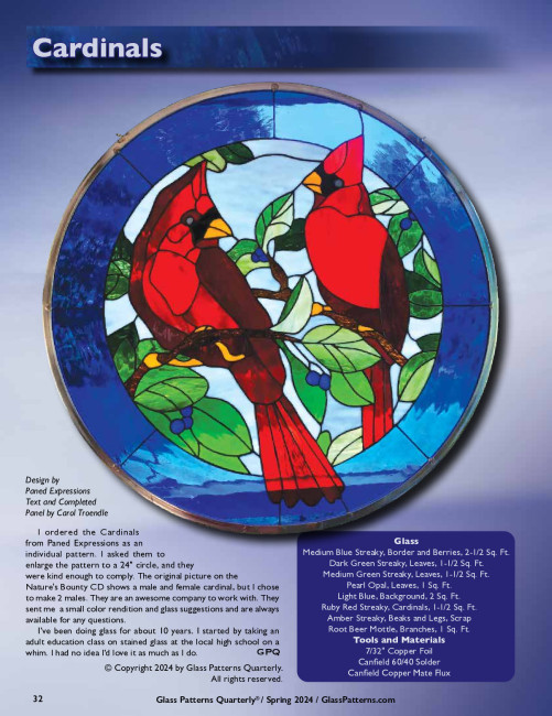 This 24” round piece features two bright red cardinals from Paned Expressions Nature’s Bounty CD. Canfield 60/40 solder and Copper Mate Flux are recommended for this project. Article originally published on page 32 in the Spring 2024 issue of Glass Patterns Quarterly®. Design by Paned Expressions Text and Completed Panel by Carol Troendle