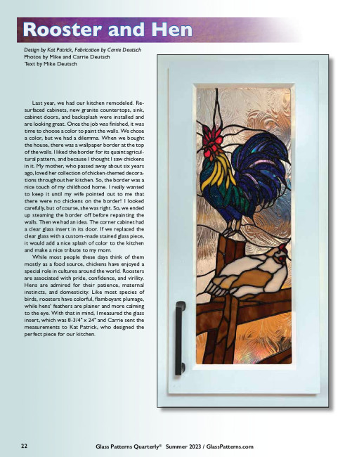 An 8-3/4” x 24” stained glass panel insert for a pantry door, highlighting a bold rooster and hen design. Designer Kat Patrick created this panel on request of the Deutsches. Carrie assembles this intricate design and frames the panel for insertion into her pantry door. This project was constructed using the copper foil technique. Article originally published on page 22 in the Summer 2023 issue of Glass Patterns Quarterly®. Design by Kat Patrick Fabrication by Carrie Deutsch Photos by Mike and Carrie Deutsch Text by Mike Deutsch