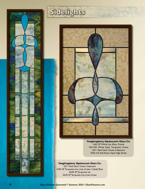 Sidelights are the vertical strips of glass off to the side of an exterior door, and Mark Waterbury has created a simple yet striking design for you to fabricate your own sidelight. Featuring Youghiogheny Opalescent Glass, we recommend using Canfield 60/40 solder and Canfield Coppermate Flux for this project. This pattern comes with three components that you can mix, match, and extend to suit your needs. Sizes range from 10” x 16” to 10” x 24”, with the tallest extending to 12” x 60”. Article originally published on page 20 in the Summer 2024 issue of Glass Patterns Quarterly®. Design by Mark Waterbury, Text by Angie Rodgers