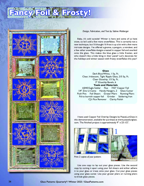 A 9” x 23-1/2” rectangular stained glass panel featuring copper overlay snowflakes and gluechip accents. This project was constructed using the copper foil technique and framed in zinc came. Article originally published on page 26 in the Winter 2023 issue of Glass Patterns Quarterly®. Design, Fabrication, and Text by Sabine Maiberger